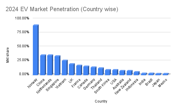 Here is a graph that shows you the country wise market share of new electric car sales as a percentage of the total new car sales in 2024. Norway is the clear winner with 88.9% of all new cars sold in 2024 being fully electric. Japan and Mexico came out last with just 2% of all cars sold being EVs.