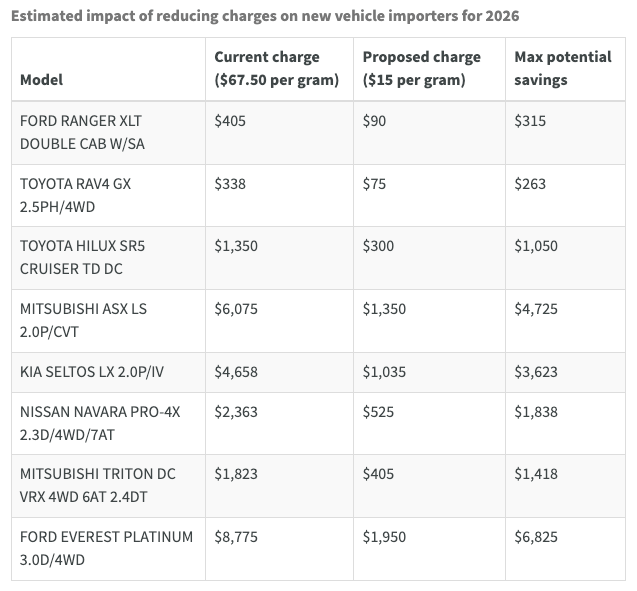 New Zealand Government – https://www.beehive.govt.nz/release/easing-cost-new-and-used-imported-vehicles#:~:text=Table_title:%20Estimated%20impact%20of%20reducing%20charges%20on,Proposed%20charge%20($15%20per%20gram):%20$1%2C350%20%7C