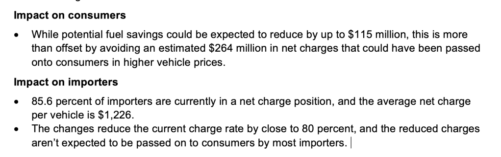 The proposed bill also says the projected fuel cost savings to the end consumer that would be made by importing efficient vehicles, is less than the projected cost that consumers would have to pay for importing less efficient (and with higher tailpipe emissions). This is quite a crazy argument because of the two reasons below.